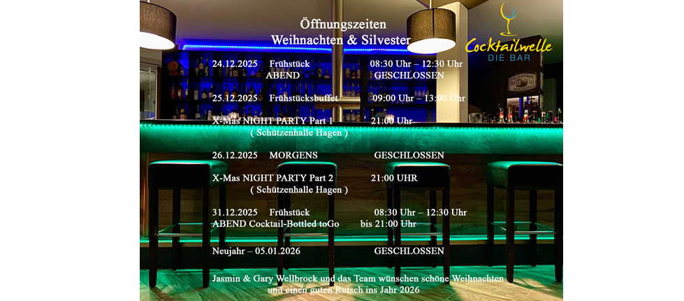 Genießt im idyllischen Hagen die Vielfalt unserer Cocktails und weiteren Getränke, die von A-Z reichen. Cocktailwelle “DIE BAR“ will Euch, ob an der Bar, in der Bacardi Lounge oder in unserer Nichtraucher Lounge mit Getränkespezialitäten verwöhnen.